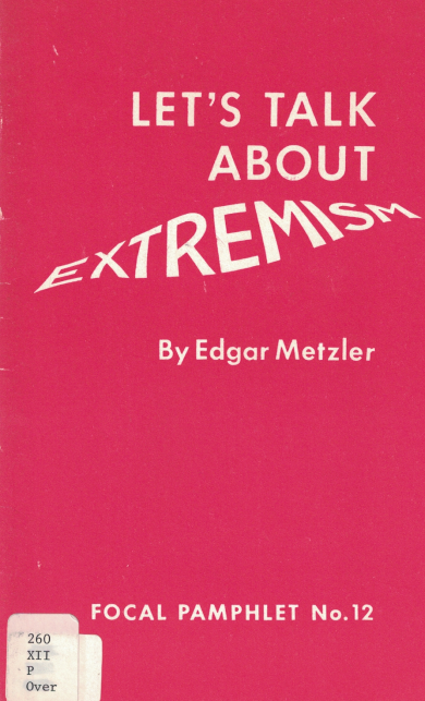 In October I published an online edition of a 1976 pamphlet called In Search of Peace that collects Metis, African American, Chicano, and Native American articulations of Mennonite pacifism. In a few days, my edition of an important but neglected Mennonite pamphlet will appear on the Anabaptist Historians site. The title is Let’s Talk About Extremism (1968), and its author Edgar Metzler – who kindly supported republication – provides a fascinating expression of what has since come to be called “pacifist epistemology.”