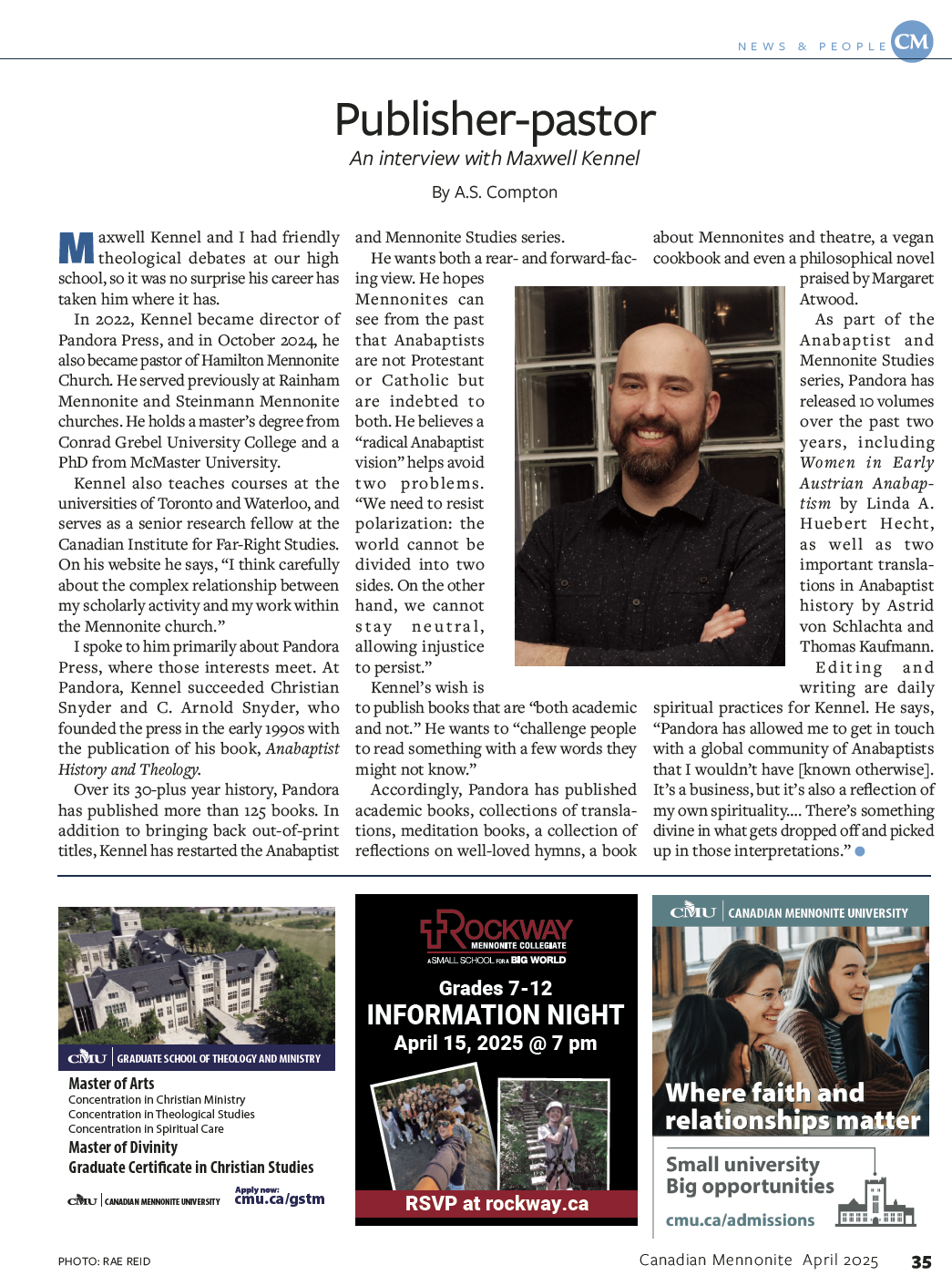 Director of Pandora Press and Editor of the Anabaptist and Mennonite Studies Series.