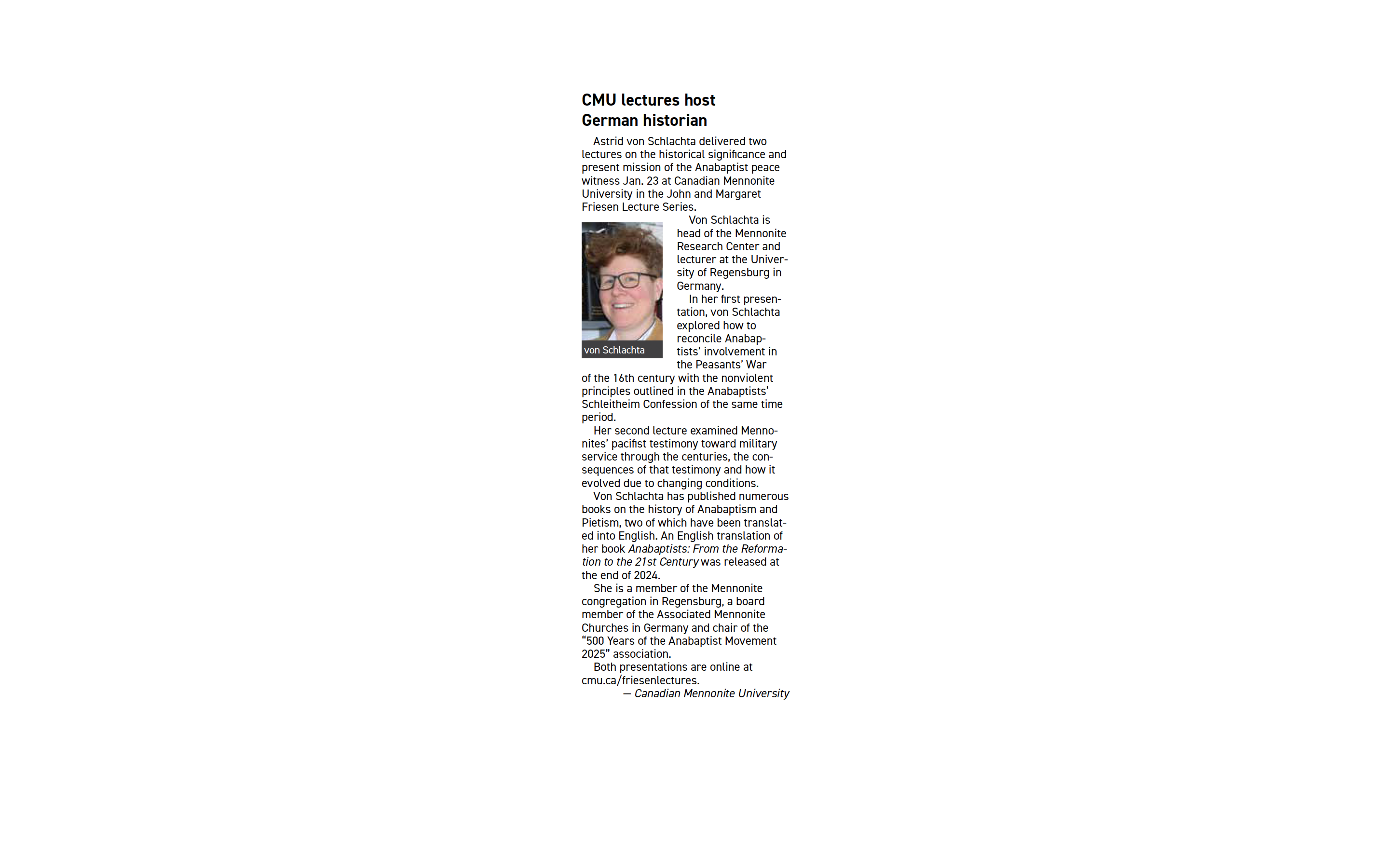 PD Dr. Astrid von Schlachta is a Lecturer at the Universität Hamburg and head of the Mennonite Research Center in Weierhof, Germany.